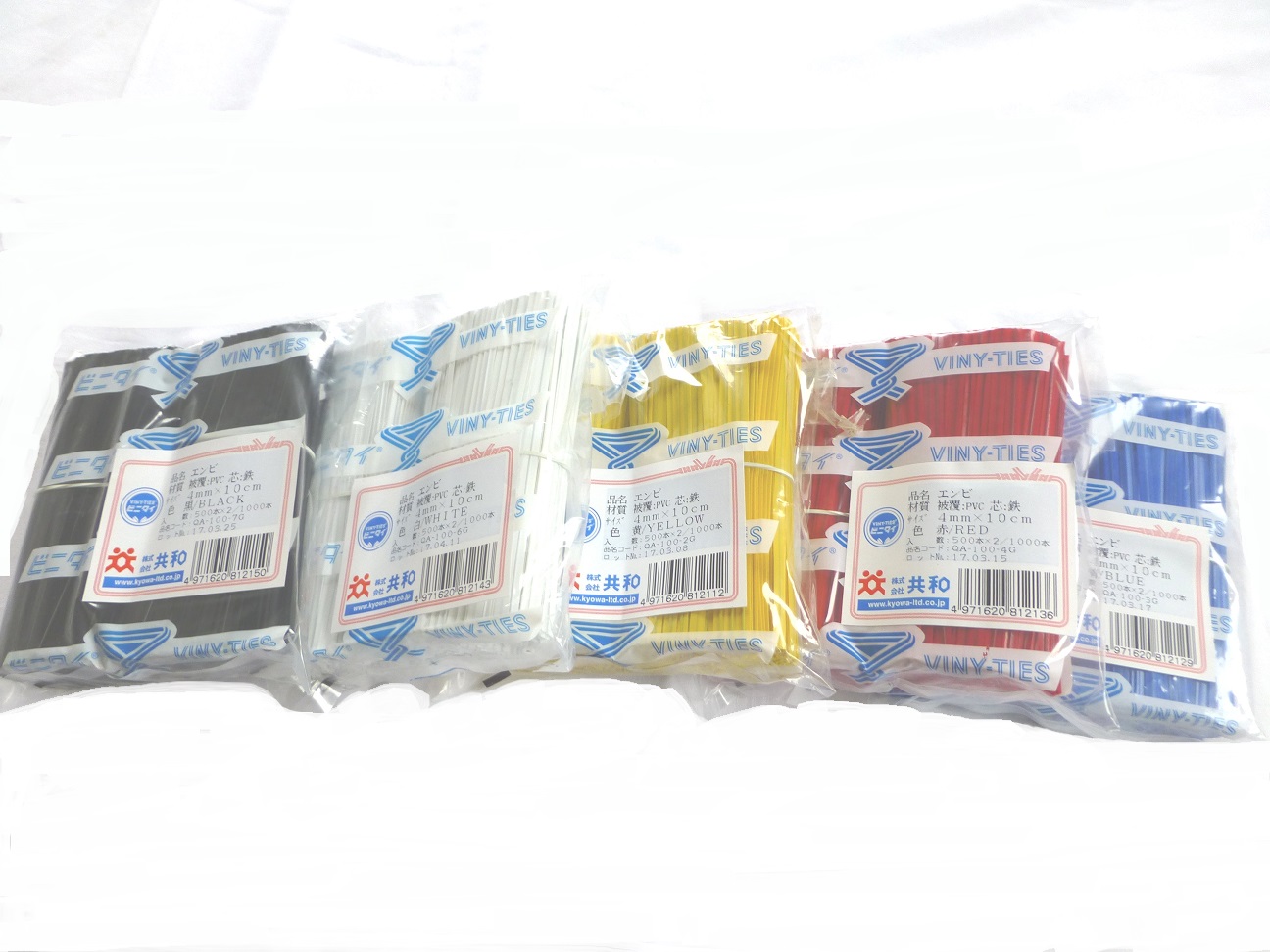 葛、和 ビニタイ PVC 4mm×10cm 1袋1000本入業務用をはじめ、家庭用、園芸用などに、幅広く使用されているビニル基材のビニタイです。お菓子や、食品の袋を束ねたり、植木をくくったり、ケーブルを束ねたり、家にあれば便利なビニタイです。サイズは、4mm(巾)×10cm(長さ)です。 1袋の重さは、260gです。お色は、黒、赤、白、黄、青から、お選び下さい。