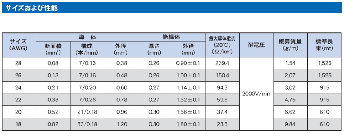 ■仕様内容■ ●導体 ■公称断面積 0.08mm2 ■構成 7本/0.13mm(錫メッキ軟銅線) ■外径 0.38mm ●絶縁体 ■厚さ 0.26mm ■外径 0.90±0.1mm ●導体抵抗 239.4Ω/km(20℃) ●耐電圧 2000V/min ●色 赤、黒、白、黄、緑、青、灰、茶、橙、紫 ●条長 1巻 1525m束巻(2.4kg)